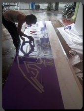 konstruksi rangka besi hollow, huruf timbul seng galvanis,cat duco ,stiker